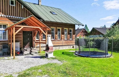 Comfortable cottage "Švýcarský dvůr Lodge", 2 storeys, detached from the 19th century. In the resort 800 m from the centre of Janské Lázně, in a quiet position, 200 m from the skiing area. Private: large garden 3'000 m2 with lawn. Patio, garden furniture, barbecue, children's playground (slide, swing). In the complex: trampoline, central heating system. Parking at the house. Grocery 1.2 km, supermarket 2 km, restaurant 1 km, café 1 km, bus stop "Janské Lázně, Lesní dům" 700 m, railway station "Svoboda nad Úpou" 2.8 km, outdoor swimming pool 1 km, indoor swimming pool 1 km, thermal baths "Janské Lázně" 1 km. Golf course (18 hole) 8 km, tennis 800 m, minigolf 2.5 km, riding stable 2 km, walking paths from the house 20 m, cycle lane 700 m, ski lift 900 m, gondola lift 1.7 km, slopes 200 m, ski rental 600 m, ski bus stop 50 m, ski school, sled run 800 m, cross country ski track 2.5 km, children's playground 200 m. Nearby attractions: Aquacentrum, Janské Lázně Spa 1 km, Stezka korunami stromů Janské Lázně 3 km, RelaxPark Pec, lanovka Sněžka 15 km, zámek Vrchlabí, Aquacentrum Vrchlabí 18 km, Špindlerův Mlýn, Zoo Safari Dvůr Králové 33 km, Adršpašské skály 42 km. Well-known ski regions can easily be reached: Janské Lázně - Košťálka 1.5 km, Černá hora - Pec 1900 m, Mladé Buky 7 km, Horní Malá Úpa 20 km, Špindlerův Mlýn 34 km. Well-known lakes can easily be reached: Dolce Trutnov 18 km. Hiking paths: krkonošské naučné stezky.