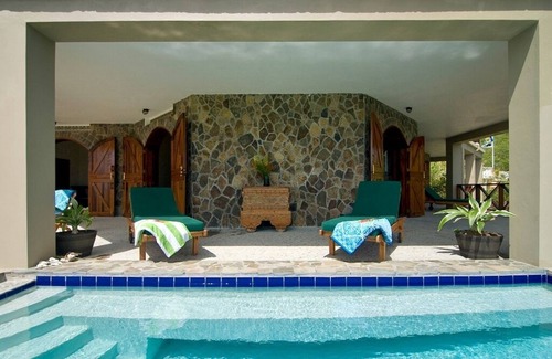 Reef House is nestled into the hillside and is constructed of local stone and Greenheart hardwood in a style that reflects the Caribbean tradition yet provides all the modern conveniences. The exterior walls are covered in cut stone which gives the house the feeling of a sea captain's villa. Reef House's pavilion style design is naturally cooled by the Caribbean trade winds that constantly flow in from the sea. No A/C is provided.