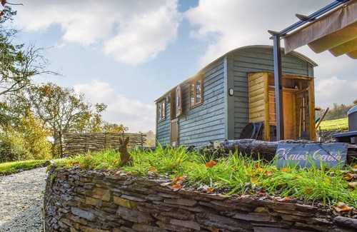 Shower Room: Cubicle Shower, Toilet. Electric underfloor central heating, electricity, bed linen and towels included. Welcome pack. Sitting-out area with garden furniture and firepit. Grounds with firepit, sitting out area and barbecue (shared). Hot tub for 4 (private). Private parking for 1 car. No smoking. Please note: No children. There are steps and a river in the grounds. . Kate’s Cabin is a beautiful adults-only shepherd’s hut with its own unique lit path leading up to a private location on this 51-acre site. This truly is the epitome of getting away from it all!