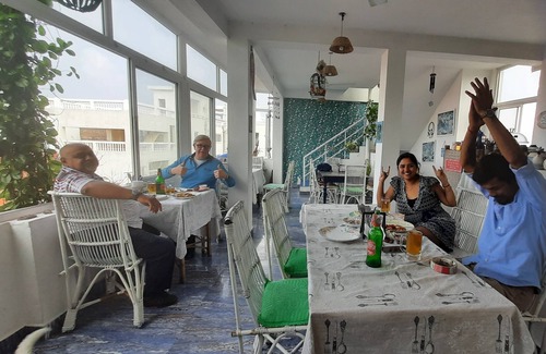 Its situated inside the fishing village in Mahabs, 20 ft away from the ocean. I live in the apt above and i run my cafe on the same floor. A beautiful terrace overlooking the ocean serves as a dine