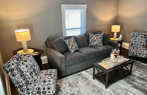 This Unit is an upper large 1 bedroom 1 bathroom which does sleep 4 with a queen size sofa bed in the living room and Kitchen is equipped with all your getaway needs. Bathroom does have a clawfoot bathtub/shower. Unit is walking distance to downtown and several restaurants and parks. This unit also features off street parking and internet TV.