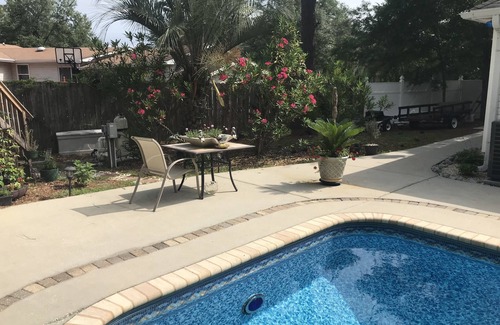 This is the perfect getaway for someone wanting peaceful surroundings, but wants access to all the action. The cottage/guesthouse includes a private full bath, kitchenette with micro-wave, fridge, 2 burner stove, garbage disposal, TV, AC/heat, wifi, and its own balcony that overlooks the beautiful swimming pool. You will have use of the pool, grills (gas, charcoal and electric), fire pit and the golf cart (golf cart is only available with this unit). The beach is just a short 3 mile cart or car drive. Close to Myrtle B Murrells Inlet & Georgetown