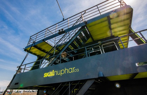 In summer, the Skal Nuphar's terrace is the ideal location to enjoy the beautiful weather and stunning views. The top deck is a modern oasis with large bean bags, adirondack chairs, a BBQ and outdoor speakers to offer you and your group the ultimate experience. Book a fireworks night for the most unforgettable evening!