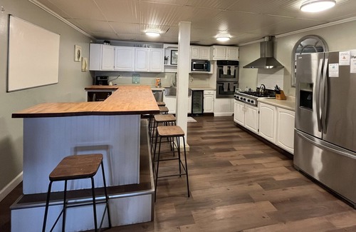 Two large seating areas in the great room provide plenty of seating and comfort for everyone! One pit of couches sits in front of a large flat screen smart TV for you to login to all of your applications. Another pit of sofas sits in front of a real wood-burning fireplace. Firewood delivery available or you can bring your own.