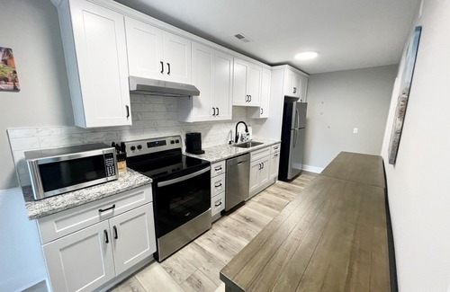 Fully Equipped Kitchen: The open kitchen maximizes space with counter seating, making it easy to socialize while cooking. You'll find all the essentials here: flat-top stove, dishwasher, coffee maker, toaster, and everything you need to prepare and enjoy meals, from pots and pans to silverware and drinkware.