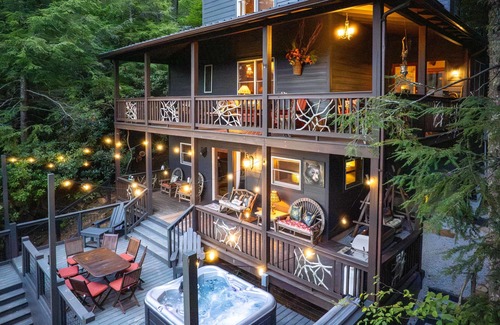 Location + Views! This Custom 3b/3.5ba cabin 10 min to downtown Cashiers (all paved and no steep Mtn. roads) Features 1000 sqft of decking, Custom Stone Firepit, Hot Tub with Mtn Views, Pool Table, 4player Arcade Game w 20k games, mature landscaping with a waterfall feature. 5 min drive to the gorgeous Waterfall of Silver Run Falls!