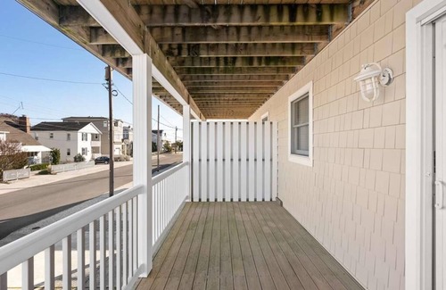 4th home from beach! Lovely Townsend Inlet Beachblock location. Upside-down style; 4 bedroom, 2 bath home with Central air and 2 big decks. Off street parking, garage and outside shower on ground floor. 1st level features 3 bedrooms, 1 full bath, and laundry area. Front bedroom has a king bed, tv, and private deck. Rear bedroom has Queen/Queen bunk and other room has a pyramid bed (single/full). 2nd floor features living/dining/kitchen area with big front deck, a bedroom with king bed and full bath. Great location!Pet deposit of $250 with signed Addendum