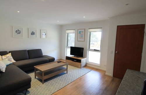 Upstairs, the spacious open plan living/dining/kitchen space makes the most of the stunning views. There is a flat screen TV, DVD player, RC/AC and a feature wood heater. The modern kitchen features a dishwasher and large fridge with ice dispenser. There is a coffee machine with milk frother - please bring Lavazza Modo Mio pods.There's dining space for 7 guests inside, with outdoor dining for 7 and a stainless steel BBQ on the large front deck as well.