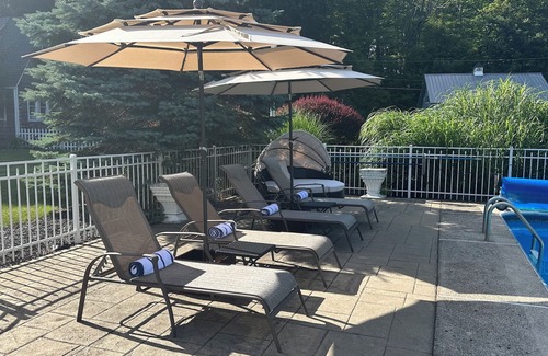 Beautiful private & secluded 17 acres mountain top retreat. 4 acres of wooded area and 13 acres of grass fields for use to play football, soccer, baseball and many walking paths. Breathtaking views, private in ground heated pool (Pool Is only open memorial day - mid September) with white sand beach area with fire pit. You'll be sure to enjoy views. Also for your enjoyment there is a swing set , horseshoe pit and an additional outdoor fire pit for roasting marshmallows by the camp fire. Grounds are fully illuminated for night time use. In the fall you have panoramic views of the foliage, nature hiking out the back door and a great time of year for the outdoor fire pit. This property is also a great winter retreat with sleigh riding right in the back yard and a beautiful wood burning fireplace to sit by. This is truly a 4 season home to enjoy. This home is located only 5 min to Lake Wallenpaupack, Claws and Paws Zoo and 25 min. to Mt.Airy Casino, The Crossings Outlet shopping, Camel back skiing & Beach & the new Tree top adventures and Zip lines ;