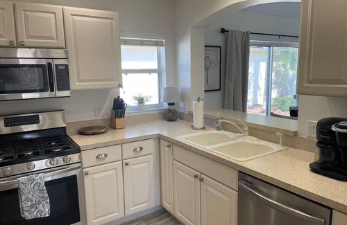 Villa is complete with linens, 65” ROKU TV, mini Weber gas grill, patio furniture in screened in lanai,Kierig drip and K cup coffee maker, lighted landscaped, washer/dryer in garage, gas stove, and keyless entry.