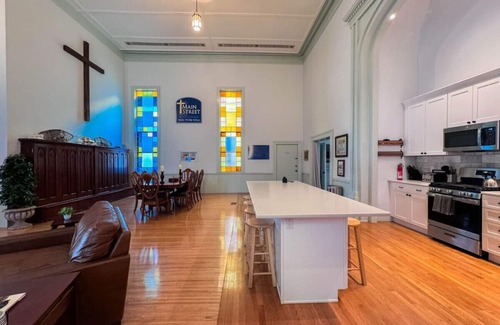 Stay in a beautifully renovated 1826 church in Conway with access to Pequawket Pond. This unique 5-bedroom, 2-bathroom home features queen beds in each room, a spacious living room with soaring cathedral ceilings, original stained glass windows, and a modern, fully equipped kitchen. With its comfortable furniture and rich history, this home offers a truly special experience. Perfect for a serene and memorable getaway!