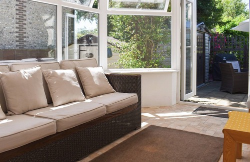 Shower Room: Walk-In Shower, Heated Towel Rail, Toilet. Gas central heating, electricity, bed linen, towels and Wi-Fi included. Highchair. Rear garden with barbecue and garden furniture. Private parking for 2 cars. No smoking.. Located in the Hampshire village of Clanfield, Sunbury Cottage is a spacious 2-bedroom bungalow with living room/diner, fully equipped kitchen including dishwasher and washing machine plus the addition of a lovely conservatory that overlooks the courtyard garden.
