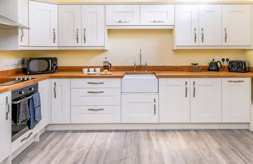 Kitchen area: Farmhouse style with electric oven, electric hob, microwave, fridge/freezer and dishwasher.