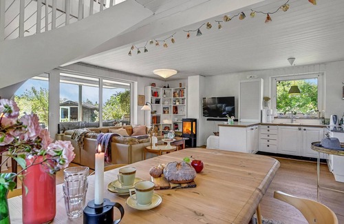 Look forward to a wonderful vacation in this pretty and brightly furnished vacation home in Egå. The focal point of the house is the large living room with integrated kitchen, where you can enjoy culinary delights while the other guests or your children relax in the upholstered furniture or have fun playing cards. In the cooler seasons you can also warm yourself here by the fireplace. From this room a magnificent staircase leads up to the upper floors, where you will find, among other things, a great bedroom with its own balcony.