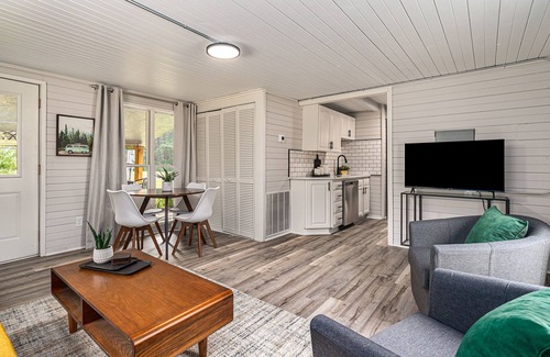 Each cabin is a testament to modern convenience blended with rustic charm. With one bedroom and one bathroom in each, they accommodate up to four guests comfortably, one with a queen bed, the other with a king and both with sleeper sofas. The fully stocked kitchens ensure a delightful home-cooking experience. Free Wi-Fi and televisions in each cabin keep you connected and entertained. (please note, there are two other cabins on the property).
