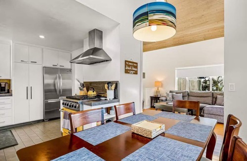 Inside, this newly remodeled home boasts high ceilings, Cali bamboo flooring, and stylish finishes throughout. Two spacious living areas provide plenty of room to relax and entertain, with one featuring a 70” smart TV and the other offering a cozy gas fireplace and 55” smart TV. Both living areas include sleeper sofas and comfortable seating. The fully equipped kitchen features high-end appliances, sleek concrete countertops, and thoughtful extras such as a Keurig coffee maker and blender, making it easy to prepare meals for the whole group. Gather around the dining table, which seats up to 10 guests, for shared meals and lively conversation.