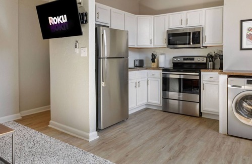 The full kitchen provides everything you need for home cooked meals as well as a washer and dryer combo.