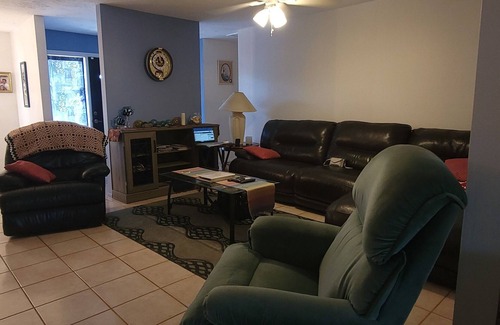 Cozy home great for family entertaining, a couple wanting to get away or a business trip! We love the set up of the house with the master on one side and the guest rooms on the other with large Living Room in the middle for family time! The master bedroom has a newly remodeled bath and large closet. The other bedrooms share a bath and hall closet. Eat at the pub table or on the lanai and watch the birds and wildlife in the waterway adjoining the backyard! The home also has a pool table, poker table and board games for a little evening fun. The Living Room, master bedroom and both guest rooms have flat screen TV's with cable. The 3rd bedroom has a smart TV and with free WiFi you can watch Netflix ,Hulu, play games etc.