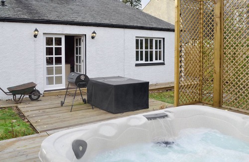 Bathroom: Slipper Bath With Shower Attachment, Heated Towel Rail, Toilet. Oil central heating, electricity, (£30 fuel charge per booking), bed linen, towels, Wi-Fi and logs for wood burner included. Welcome pack.. Enclosed lawned garden. Sitting-out area with garden furniture. Hot tub for 6 (private). Private parking for 1 car; additional on road parking. No smoking. Please note: There are 3 steps to the hot tub.. This gorgeous, detached, whitewashed cottage is located in the tiny hamlet of Bridgend of Lintrathen, near the shore of the Loch of Lintrathen – a stunning and picturesque body of freshwater, in the heart of rural Angus. The cottage is warm and welcoming, well laid out and tastefully furnished, combining contemporary furnishings with a cottage feel. The well-equipped kitchen opens onto a delightful, enclosed rear garden with a fabulous hot tub set on a raised covered deck. Enjoy an al fresco meal prepared on the barbecue while relaxing on a sunny afternoon. Lovers of coffee and glorious homemade food are equally well catered for, the cottage being in walking distance from one of Angus’ hidden treasures, the owner’s café, perfect for coffees, lunches and cakes, ideal after a leisurely walk round the loch.