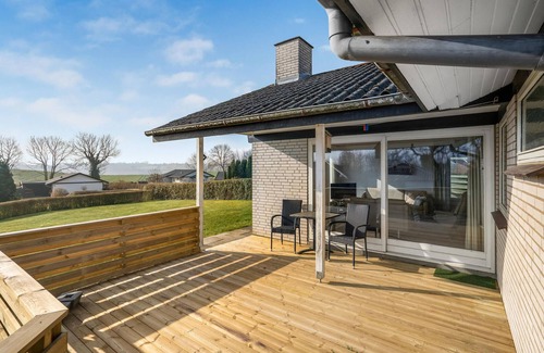 This vacation home invites you to a relaxing and pleasant vacation close to the Danish Baltic Sea beaches. Open the door in sunny weather, step out onto the large and partially covered terrace and enjoy the beautiful view of the countryside. The small table offers an ideal place for your morning coffee.