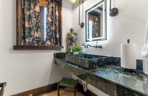 The kitchen and two dining areas offer room to host a royal feast. The kitchen is outfitted with all the cookware, dishes, utensils, spices, dishwasher pods, coffee bar, and appliances you will need. The kitchen dining/game table seats four and the expansive dining table seats eight. After feasting, guests can enjoy playing board games or a round of shuffleboard or foosball. The living room provides ample seating with thrones fit for a king and queen. The living room has a 70in flat screen TV, Nintendo Switch docking station and bluetooth speaker.