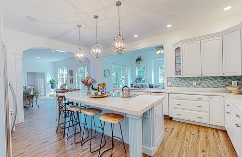 The spacious living room is adjacent and open to the kitchen with big, comfy furnishings. The sitting area off of the kitchen has more comfortable furnishings and a big-screen TV. The inviting den has leather furnishings and a TV. The open and updated kitchen features a full Sub Zero refrigerator and a full Sub Zero freezer, a fantastic island for prepping, and all the amenities. A separate dining room has seating, the kitchen table provides additional seating, and the kitchen island has stools.