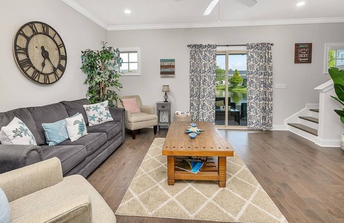 This 3BR/2.5BA town house has spectacular views of the community pond from a fully screened in back porch with a gas grill, couch and seating area for 6 people. The entry is blanketed with white shiplap walls and coastal farmhouse interior decor. With an open concept living space, there is enough room for everyone to enjoy a relaxing vacation. The kitchen is fully equipped with plenty counter space to host a large family, as well enough seating for 6 people in the dining area and 2 on the bar stools. The living room has a couch, two arm chairs, a smart tv, and a sliding glass door to the screened in porch; for that indoor/outdoor atmosphere.