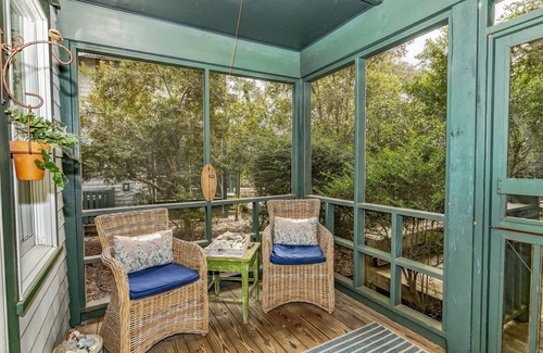 Enter through a comfortable living room where you can enjoy a movie on the large screen tv, play some games provided with the home, or just sit and relax. The eat in kitchen includes a table that comfortably seats 7, with a quaint built in bench. The kitchen is well-stocked with stainless steel appliances and everything you need to cook meals after a day at the beach. If you prefer to dine outside, enjoy your dinner or a glass of wine and hors d'oeuvres on the screened in porch.
