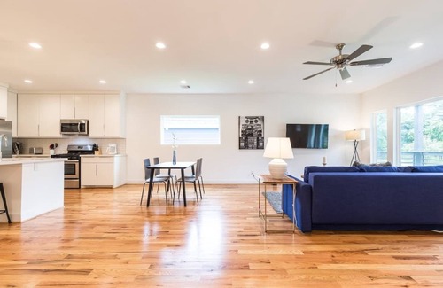 Fully furnished. WIFI and Smart 50" Roku TV. Energy Efficient Air Conditioning & Heating. Office Desk. Washer/Dryer inside the unit. Stainless appliances. Red Oak Hardwood Floors. Quartz Counter-tops. Custom Cabinetry. Full Kitchen. Fully Stocked Kitchen with Utensils, Plates, Pots, Pans and Cooking Spices. Complimentary Coffee and Water.