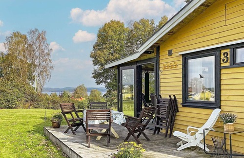 Welcome to a quiet summer cottage area with beautiful nature and a nice view of the lake. Here you live well in a pleasant area, perfect for those of you traveling with children or groups of 4-5 people. There is plenty of space for outdoor play in the large garden that runs around the house. If you want to play football, you can do it at the front of the house. On the back by the entrance large solar panel which is sensitive. The house offers charging for electric cars at a favorable price, which is settled on the spot with the home owner. There is a large glazed patio overlooking the lake that sparkles below. In here you can enjoy the warmth, view and good dinners. If you just want to sit outside in the fresh air, there is also a balcony in a sunny position. The interior of the house is of an older style, furniture in pine and the kitchen in the same spirit of the times. You are welcomed into the kitchen, which has an open floor plan with kitchen area and dining table for 4-5 people. Straight ahead you reach the glazed conservatory. To the left is the house's common room combined as a bedroom. Here is a sofa bed 140 cm and an adjustable bed of 90 cm. There is also a small desk, rocking chair and TV corner with a wide range of channels in German, English and Swedish. To the right of the kitchen is the house's second bedroom. Here is a pull-out bed that is 140 cm 2 x70 cm. Bathroom with wc, shower cubicle and washing machine. Good to think about the water consumption in this house when flushing. On the large lawn, a robotic lawnmower walks and takes care of Santa. Perfect if you want to stay 2 weeks or travel with small children. Be vigilant so that there are no toys or other things in front that can get in the way. The homeowner also offers a sauna which is located in a separate building walking distance, approx. 200 m. This is for a fee which is settled on the spot. The area has a child-friendly and nice swimming area with both lawn, barbecue area and sandy beach. There is also a bathing jetty, football goal and other cozy things for those who like sun and swimming. If you like excursions, there are plenty of beautiful hiking trails. A visit to Gräne Mine is highly recommended. Take a day trip to the famous department store Gekås in Ullared, only 30 km away. This house is not for companies or youth groups. The house owners live in the house that borders the plot and are helpful when needed. Warm welcome to a quiet area with a lake view!
