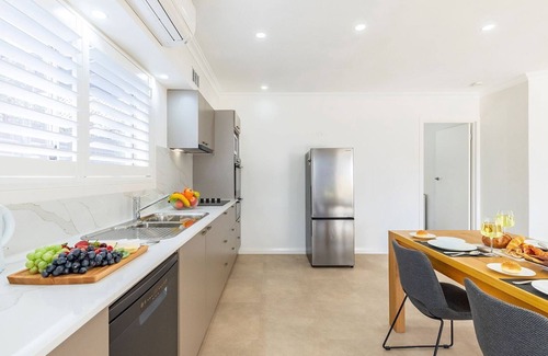 The stylish living area has a split system air conditioner, large Smart TV, soundbar and free unlimited Wi-Fi. The kitchen features gorgeous Caesar stone benches, complete cooking facilities including wall oven, electric hotplates, microwave, and a family size fridge/ freezer.