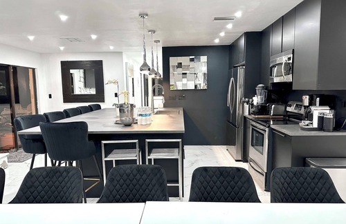 The dining table can seat up to 12 people, making it the perfect place for a family dinner or a fun game night. The living room features an oversized sofa group and a 75-inch plasma smart TV, perfect for movie nights or catching up on your favorite shows.