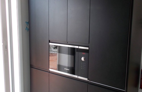 A modern minimalistic kitchen with everything you need. Induction hob, oven with grill, choice of coffee makers, a wide range of kitchen utensils, pots and pans, dishwasher, large American fridge / freezer with ice maker and filtered chilled water, (there is no need to buy bottled water) microwave, toaster, kettle, plenty of crockery and cutlery, everything you might need.