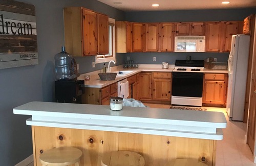 Our beautiful home has five bedrooms, three full bathrooms, and 1.5 kitchens, plus an outdoor grill. The loft has 5 additional beds, a futon, a TV with gaming system and two full size bean bag chairs, making it the ultimate hangout and crash pad for the kids in your group. The large basement family room provides another gathering area, complete with Classic Arcade game console featuring 25+ of your favorite old school games (Ms Pac-Man, Dig Dug, Galaga, Frogger to name a few) ping pong, and foosball tables, as well as another tv and a walkout patio to the backyard. A two-story picture window in the living room frames a gorgeous view of Lake Lancer.