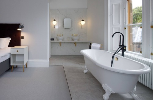 Shoeburn North is a wonderfully large and airy bedroom-only option when staying at Lews Castle. Featuring the iconic free-standing tub within the bedroom, plus a beautiful en-suite shower room, indulge in the finer things when staying in this first-floor room. There is also a double wardrobe with coffee station, a desk and beautiful armchair. The views from the bedroom overlook the main entrance, car park and trees beyond.