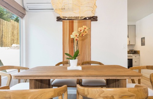 • Outdoor Spaces: Enjoy your own private wrap-around garden, where lush tropical landscaping creates a serene, Bali-inspired oasis. In addition, the communal garden features tranquil Buddha statues, ample seating, and a cozy daybed for lounging. Both spaces provide the ideal setting for groups to unwind, connect, and enjoy moments of peace together.