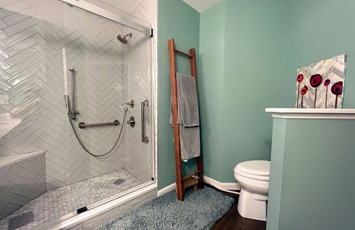 Fully-accessible 1 bedroom apartment 10 minutes away from downtown Frederick, MD. This ground-floor apartment includes a fully-equipped kitchen, living and dining rooms, office space, laundry and assigned parking space in front. The newly-renovated bathroom features a walking shower with grab bars.
