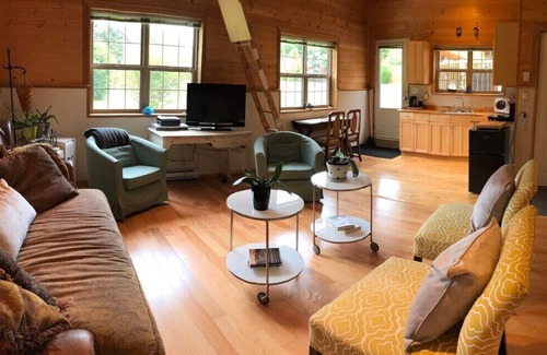 Ground level private entrance; kitchenette, dining space; a comfortable living room; 3 pc bathroom with heated floors; a beautiful rebuilt Douglas Fir loftstairs; deluxe Queen, Double and Murphy beds.