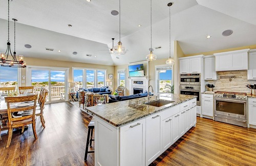 Top Level 4: Make your way to the fourth level, where you will find an opulent great room with large picture windows and a panoramic ocean view. Step outside and enjoy the picturesque views, tranquil breeze, and warm sun. The great room features a large open entertaining area professionally decorated with upscale décor. Comfortable seating surrounds the 58" flat-screen TV with a multi-speaker surround sound system, gas fireplace, and half bath. The dining area also offers ocean views and seats 12, and the wet bar with mini fridge is within arm's reach, providing additional space to spread out buffet meals and mix drinks for your group. The spacious kitchen has everything you need. With two sinks, two dishwashers, two refrigerators, and double ovens, every details is designed to make meal prep a breeze. The stainless-steel appliances, expansive granite countertops, and beautiful custom cabinetry truly define the kitchen. The kitchen island offers seating for 6 .Finishing out the top level is Bedroom #6, a King suite with stunning ocean views and access to a covered porch. The attached private primary bath features a custom tile shower, soaking tub, and a double vanity.