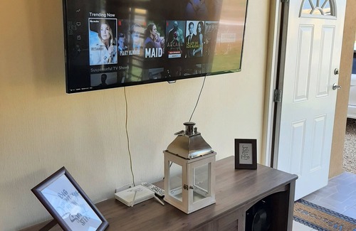 The property features a beautiful living room equipped with a sofa, TV stand, 55" smart TV mounted and can be adjusted to allow viewing from all angles, completed with free Netflix and other streaming services.