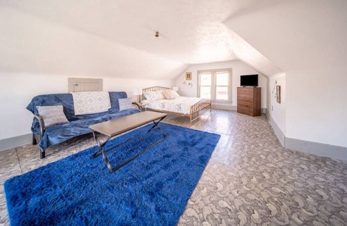 The master bedroom is the expanse of the entire 3rd floor offering a King bed and TV! There's a desk for quiet work and a Queen sized Futon Bed for extra sleeping arrangements.