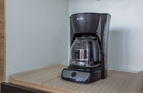 The kitchen is equipped with a refrigerator, as well as a coffee maker, a microwave, and cookware. Other amenities include a BBQ grill, bed sheets, and an ironing board.