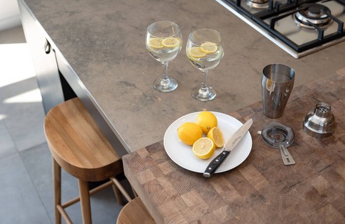 Size: sleeps 10 in 5 bedrooms Beds : 2 x super king size beds, 1 x king size bed, 1 set of bunk beds, 1 x set of twin beds. Accommodation Entrance : spacious hallway, access to three ground floor bedrooms, bathrooms and living area. Ground floor Bedroom 1 : king sized bed, bedside chairs and lamps, armchair and built in wardrobes with shelving. Ensuite shower with tiled walk-in shower area, WC and hand basin. Bedroom 2 : bunk beds suitable for children up to 12 years, bedside lamps and chest of drawers. Bedroom 3 : twin beds (zip/link option for super king bed) bedside tables and pendant lamps, chest of drawers and hanging rail. Ground floor shower room : walk in shower, shaver point, WC and hand basin Study : with desk and chair with views over the garden. Sitting room : wooden floor, Smart TV with Netflix, wood burning stove (one basket of logs and kindling provided on arrival), patio doors overlooking garden, 5 seater corner sofa, coffee table and chaise. Living area - sitting, dining and kitchen areas: two floor to ceiling windows, hand built kitchen, beautiful furniture and tiled floor throughout. Two 3 seater leather sofas, armchair and footstool, coffee table, integrated woodburner (one basket of logs and kindling provided on arrival), dining table with seating for up to 10 guests. Solid wood kitchen with two ovens, dishwasher, gas hob, large fridge freezer, instant boiling water tap. Cloakroom: WC and hand basin Utility Room : washing machine, dryer, vacuum cleaner, clothes dryer, iron and ironing board