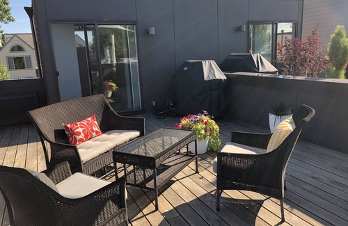 Enjoy the beautiful view of Puget Sound from the rooftop deck with comfortable patio furniture and BBQ. Great for a romantic dinner or family BBQ.