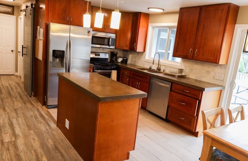Aloha House is a 2-bedroom and a 1-bath home. The full bathroom is a tub shower combo. Basic kitchen utensils such as pots, pans, plates, cups, and silverware are available. There are 2 sofas and a large Smart TV in the living room. The kitchen has a gas oven range and rice cooker. Paper towels, toilet paper, shampoo, bath towels and beach towels are also provided. Guests can use the paddle board, surfboard, and kayaks available. Guests have access to the washer and a dryer. There's even a Pack N Play for small children. You can park up to 2 cars on the right side of the open garage.