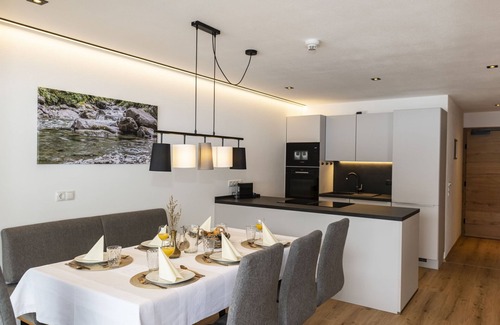 "Alpine Residence Auszeit", 4-room apartment 95 m2. Very tasteful furnishings: 2 double bedrooms. Large kitchen-/living room (oven, dishwasher, 4 ceramic glass hob hotplates, toaster, kettle, microwave, freezer, electric coffee machine) with 1 pull-out bed, dining table and satellite TV. Exit to the balcony. 2 showers/WC. Heating. Balcony. Balcony furniture. Very beautiful view of the mountains. Facilities: Internet (WiFi, free). Parking. Please note: suitable for families. Non-smokers only.