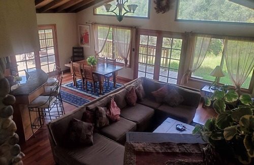 Alta Vista Peak is a three-level, three-bedroom mountain home with a cabin feel located in Three Rivers, California and just 1.8 miles (5 mins) to the entrance of Sequoia National Park. The two bathrooms were built using a large amount of river rock to help create a mountain river ambience. There is a fireplace on the main floor and a wood burning stove in the master bedroom. The kitchen was created with a gourmet chef in mind! Lots of room and high quality appliances to prepare meals to perfection. There is a large deck that overlooks the entrance to Sequoia National Park. From the deck and all the east facing windows is the spectacular Morro Rock. A solid granite rock similar geologically to Yosemite’s Half Dome.