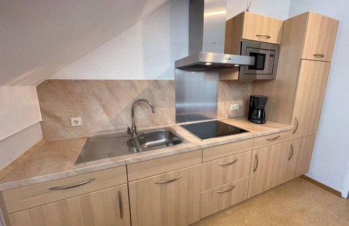 "Am Schwimmbad", 4-room apartment 65 m2 on 1st floor. Cosy furnishings: living/dining room with sloping ceilings with satellite TV. 2 double bedrooms. 1 room with 2 beds. Open kitchen (4 hot plates, dishwasher, toaster, kettle, microwave, electric coffee machine). Shower/WC. Facilities: hair dryer. Internet (WiFi, free). Parking (1 car) at the house. Please note: suitable for families. Non-smokers only. Smoke alarm.