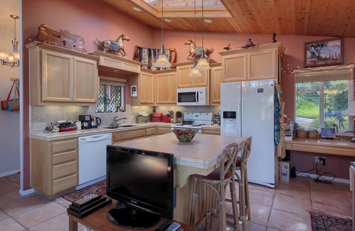 Open the front door to discover the surprise of an art-filled retreat — cozy, airy and visually stunning. Perched on the flank of Cambria’s Park Hill, this light-filled refuge is close enough to the ocean that you can see and hear the distant waves crashing on Moonstone Beach. You are just up from Shamel Park, a few blocks from the expansive trails of Fiscalini Ranch and a 15-minute walk from the shops and restaurants of West Village. This home is ideal for a romantic weekend for two, a solo writing retreat, or a fun getaway for family and friends. The open-plan house is surrounded by green space on all sides, making it a quiet refuge with views of the ocean, pine trees, and coastal hills through the many windows. You can also see a huge expanse of stars through oversized skylights. The large deck is perfect for morning tea, afternoon reading or sunset viewing after a day of wine tasting in nearby Paso Robles or a tour of Hearst Castle in San Simeon. Each of the two small bedrooms has a queen bed and bathroom/shower. Two comfy air mattresses with linens are also available. The house is equipped with a well-stocked kitchen, a nice upright piano, WiFi, Smart Tv, many books and a stereo. This property is pet-friendly. Steep Driveway. Enter driveway on the far left side of-which is not very steep - and either park in front of outdoor table or angle into carport. TOT#6004416