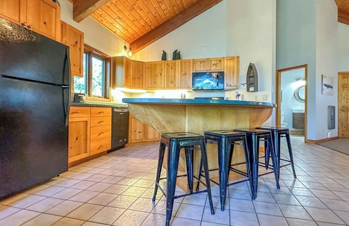The home has 3 bedrooms and 2.5 bathrooms, including a spacious master suite on the main level. In addition to the two living areas, there's a full sized kitchen and a dining room area, a perfect gathering place for the whole family. Unique artwork and carefully selected furnishings make this home warm and welcoming. The beautiful wall to wall windows allow you to take full advantage of the Devil Track Lake views year round.